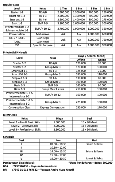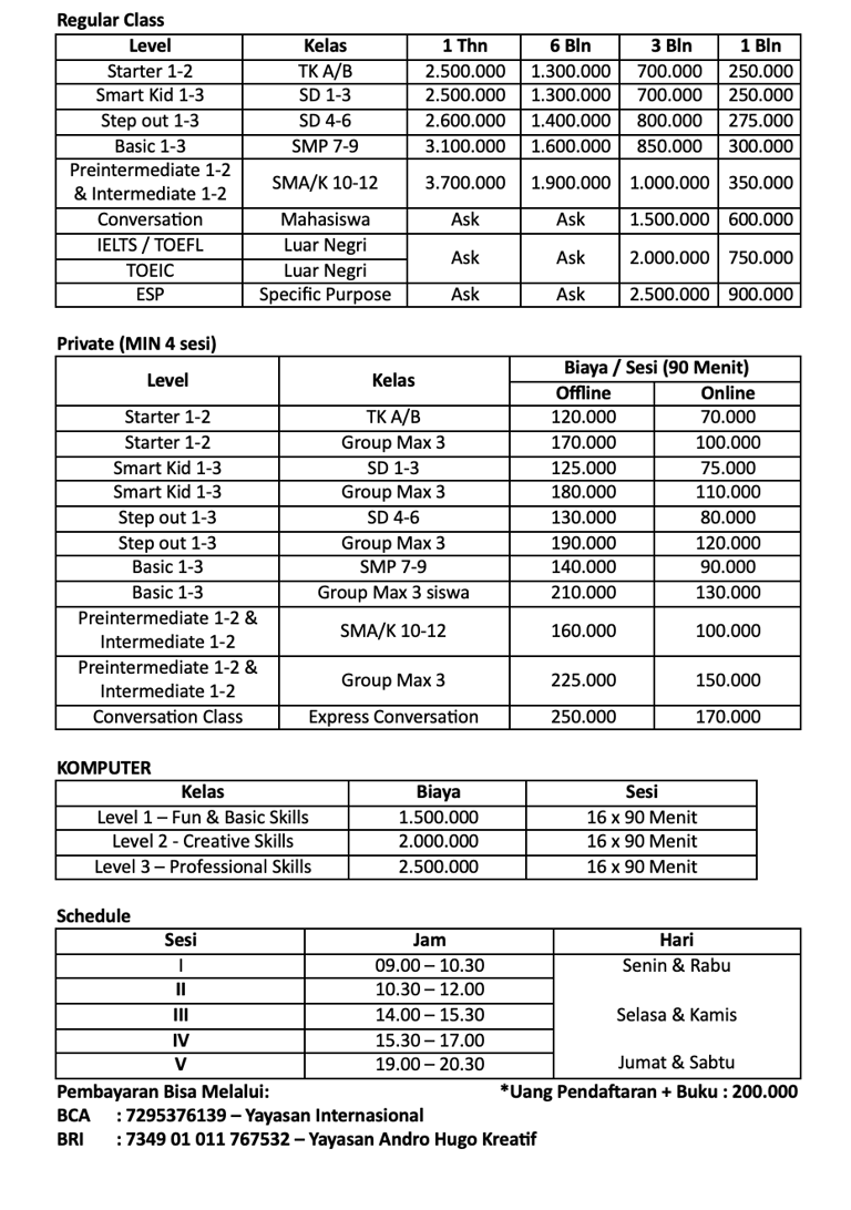 Kami menyediakan berbagai kelas kursus Bahasa Inggris mulai dari anak-anak hingga dewasa, lengkap dengan pilihan kelas reguler, privat, dan online.